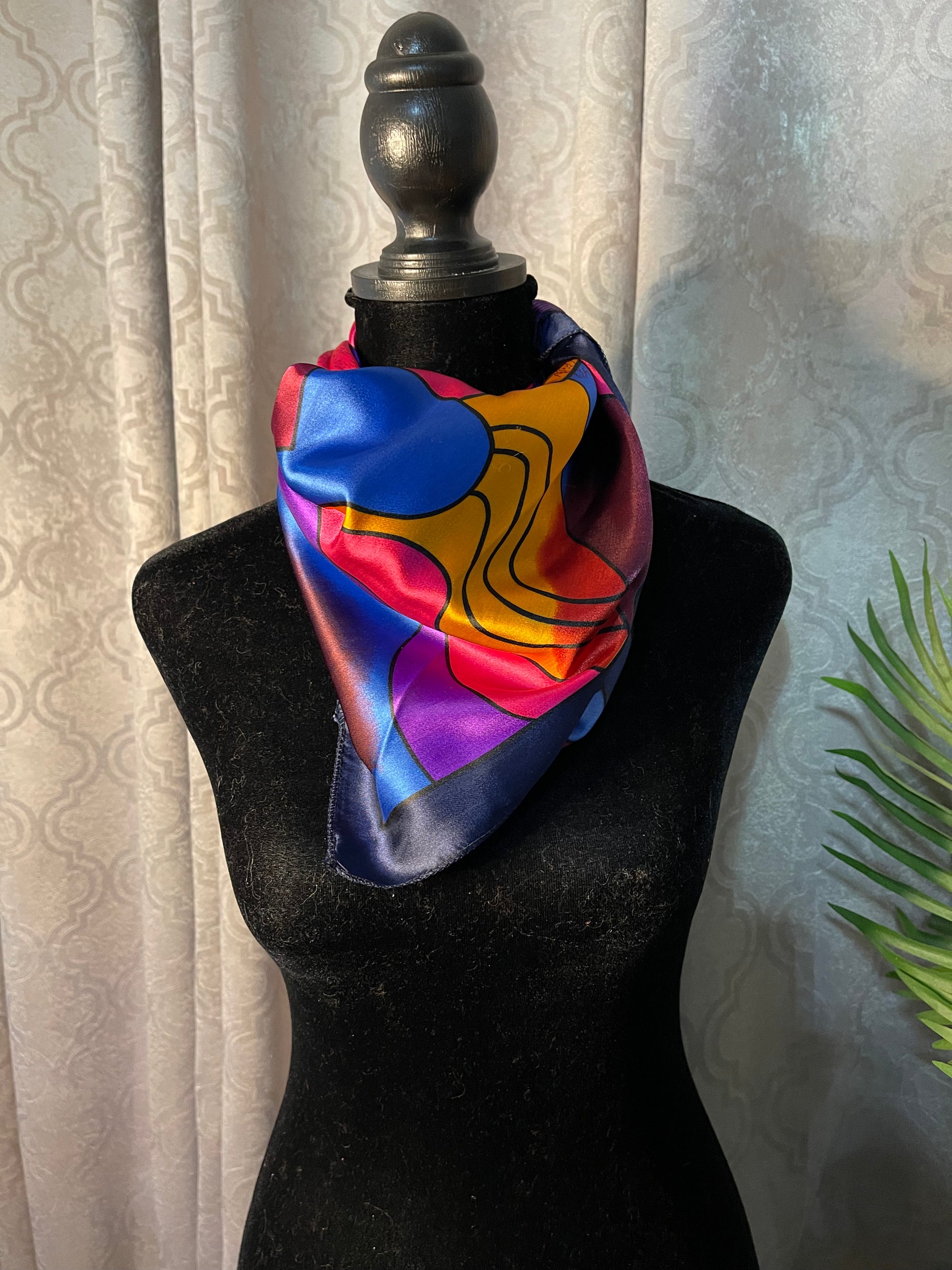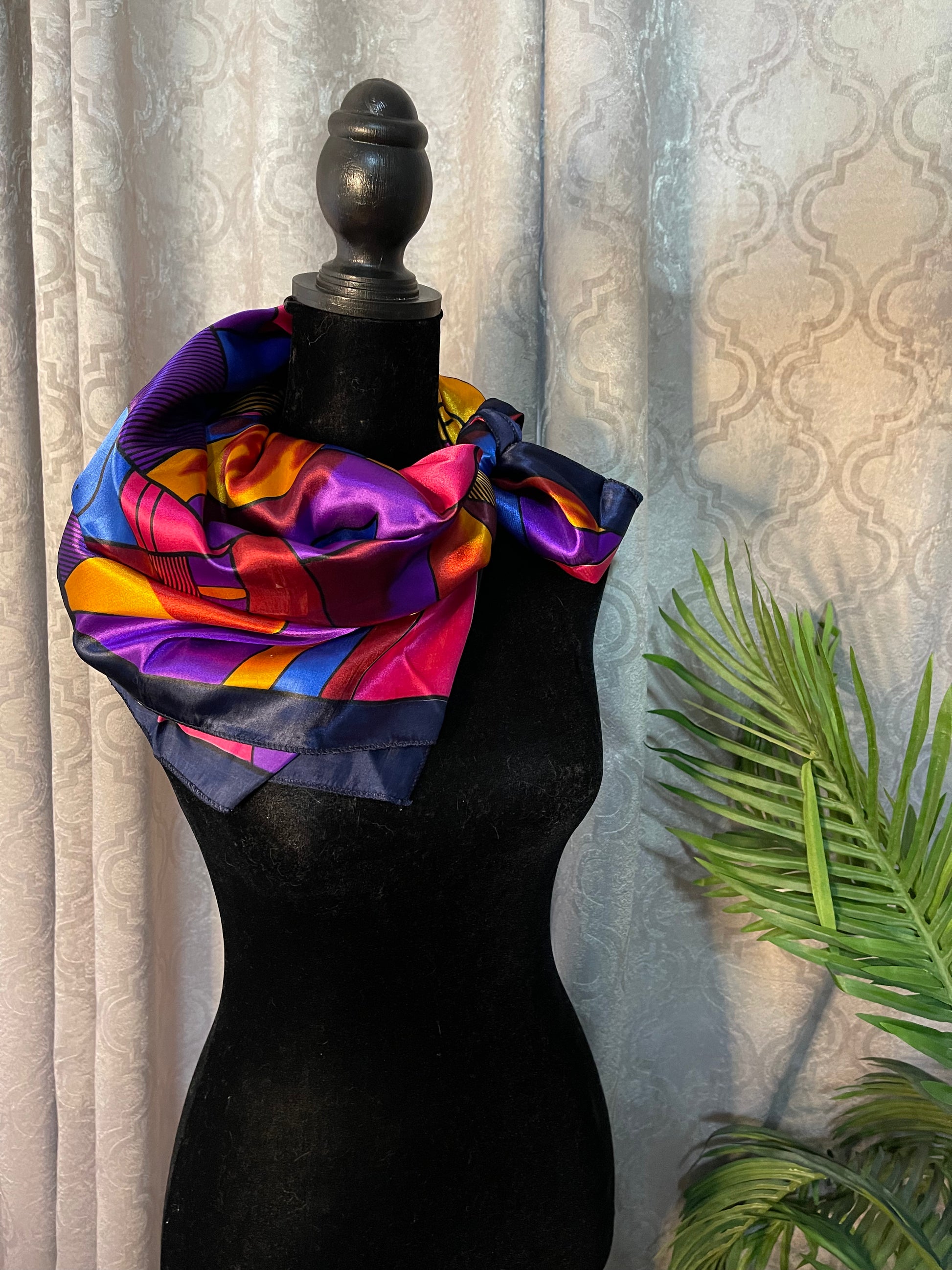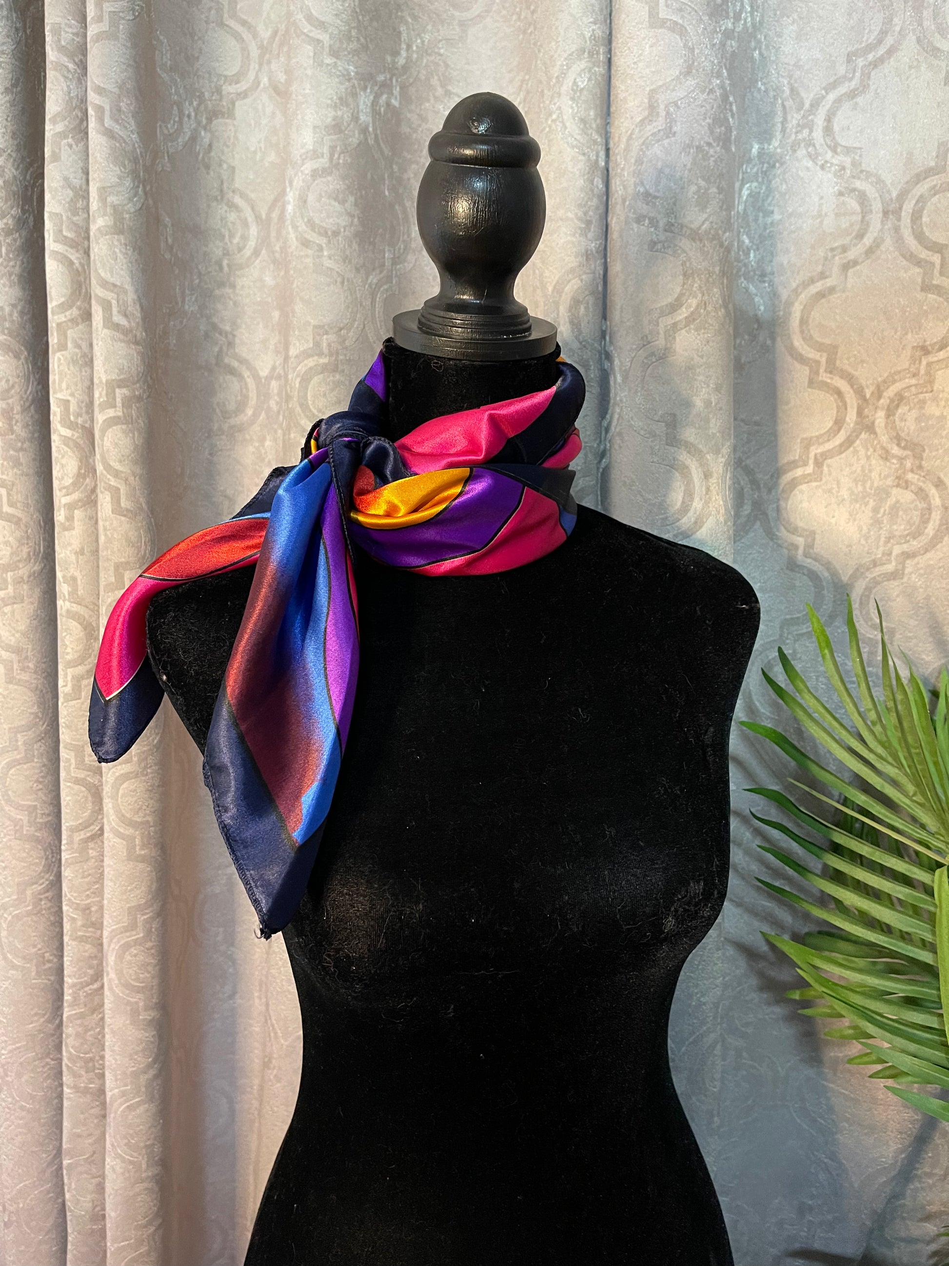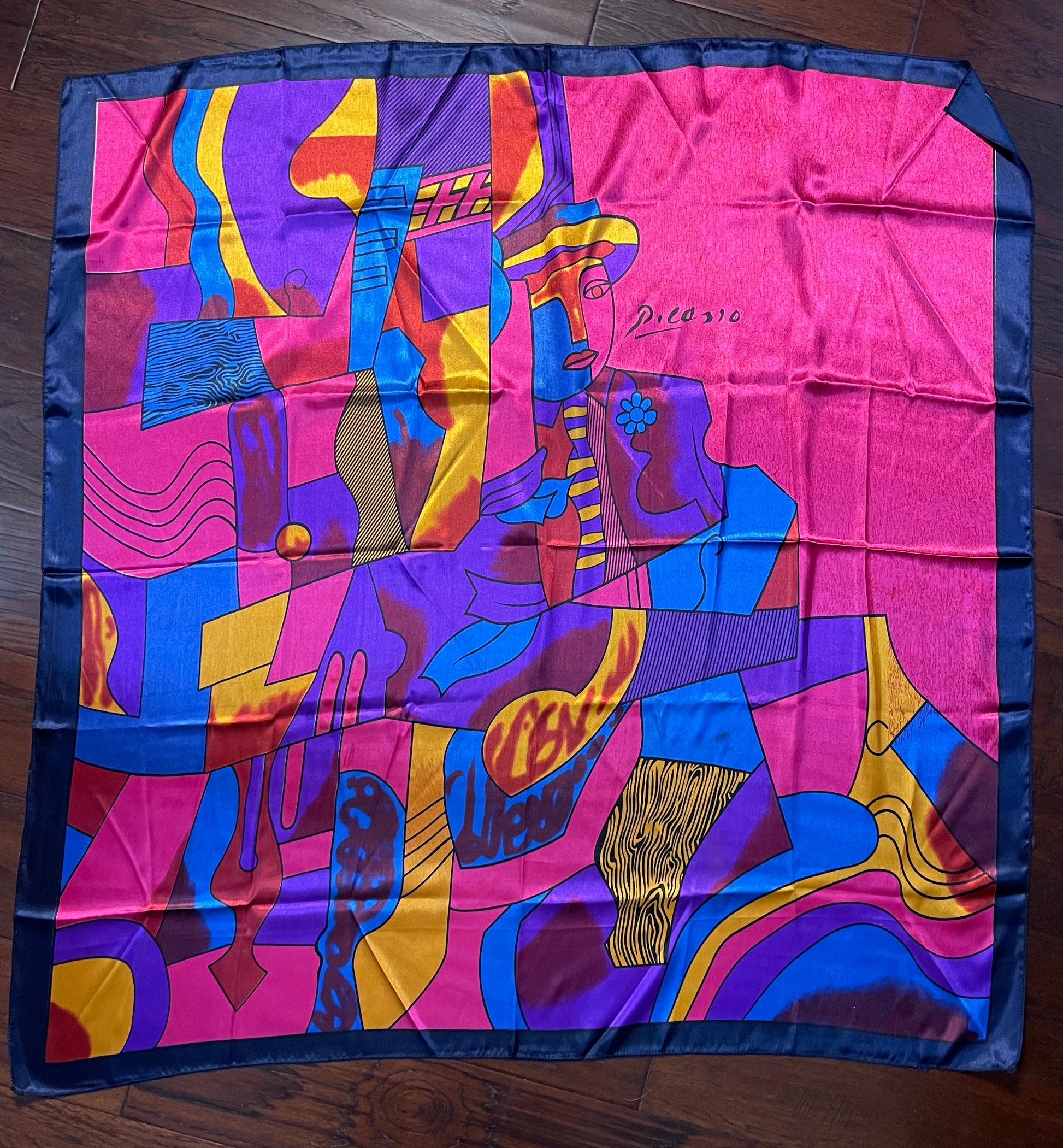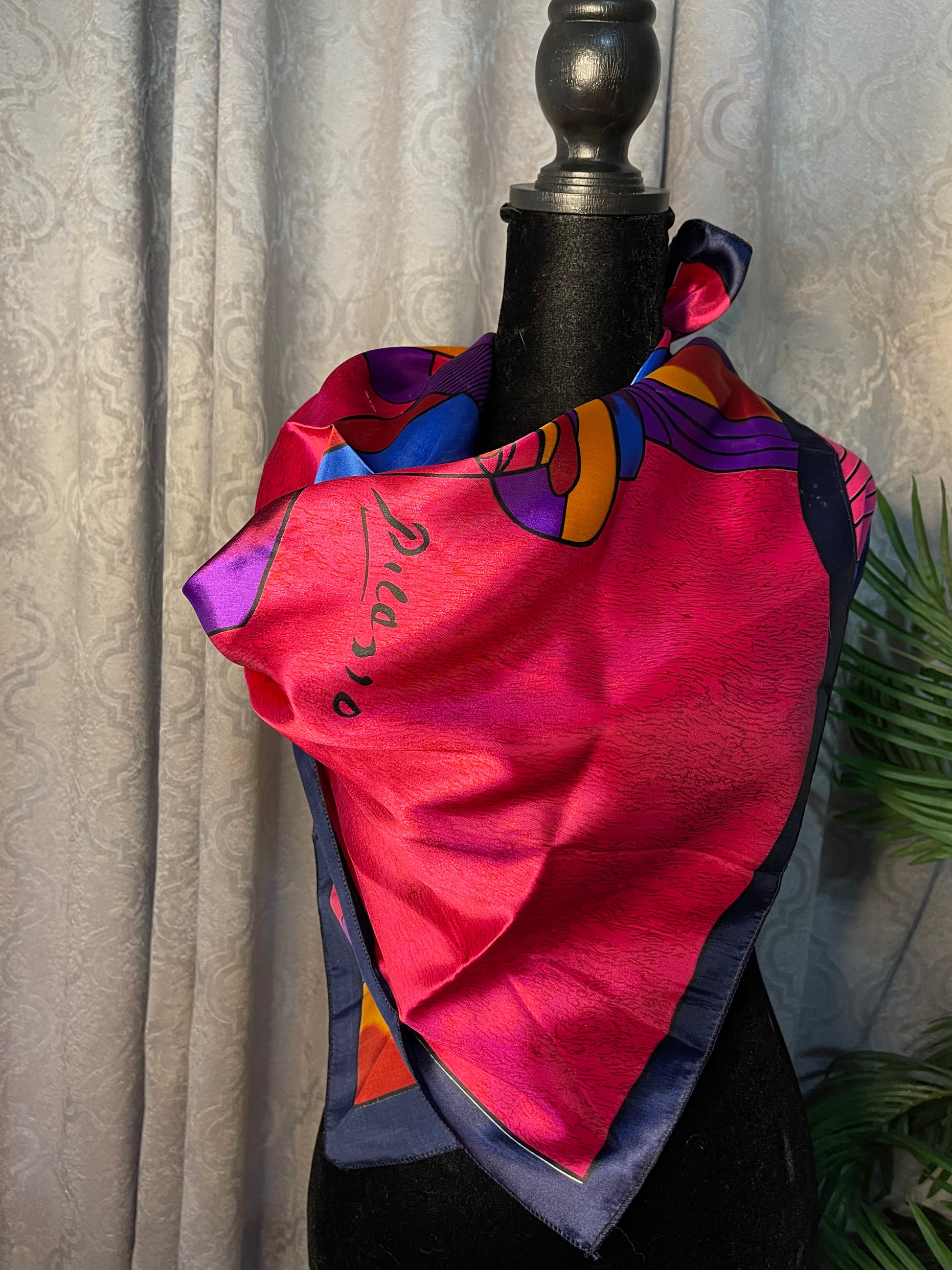 This Designer Paloma Picasso Silk Scarf is such a beautiful, vibrant and colorful scarf! This scarf is preowned and measures 36 by 37 inches. Paloma is the daughter of the very own Pablo Picasso and you can see the similarities with the style of abstract design.