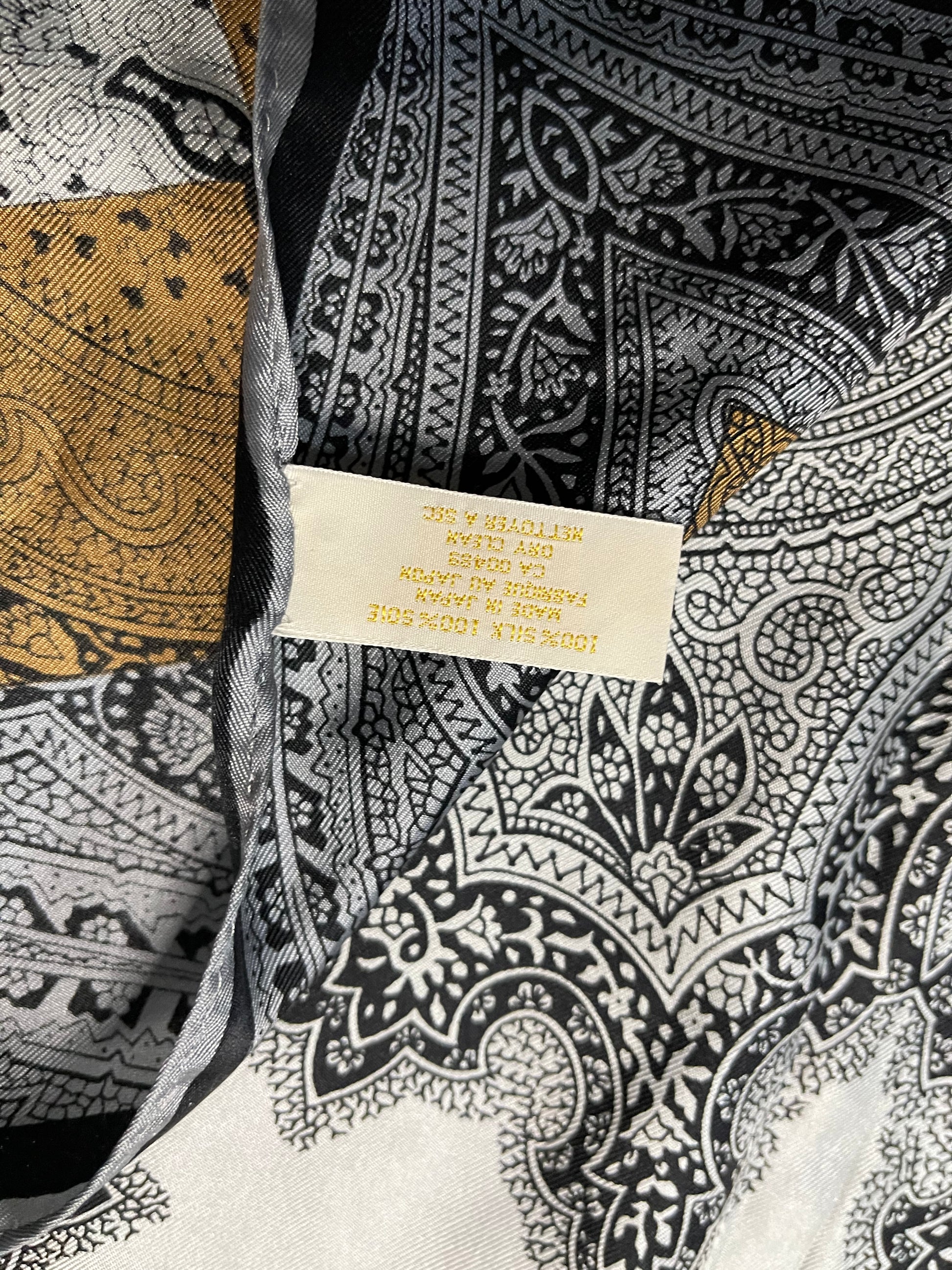 This Designer Elaine Gold scarf is 100% silk and is vintage with machine sewn edges. It is a Gray/silver with black and gold geometric and floral designs. It measures 31 cm by 31 cm.