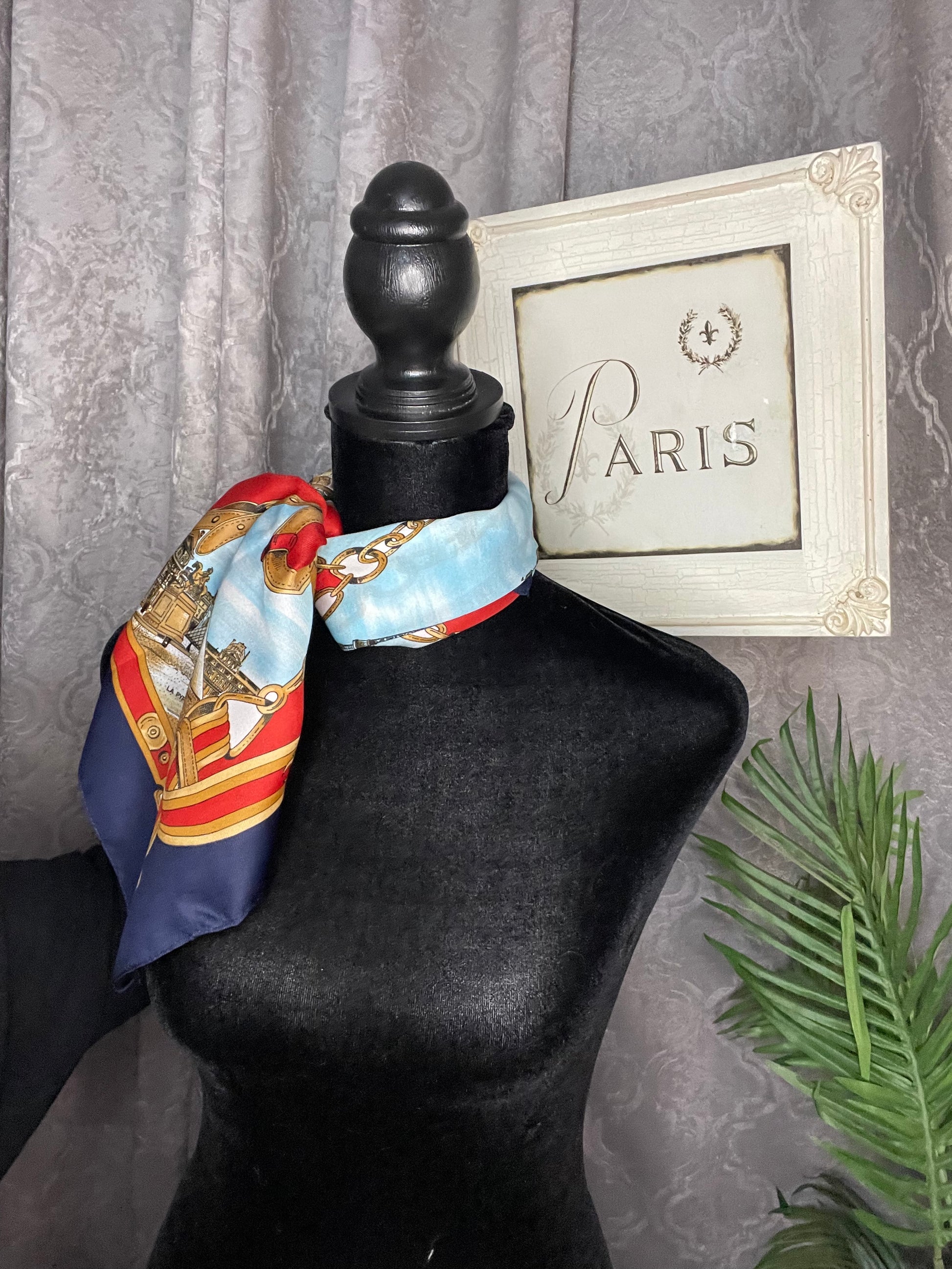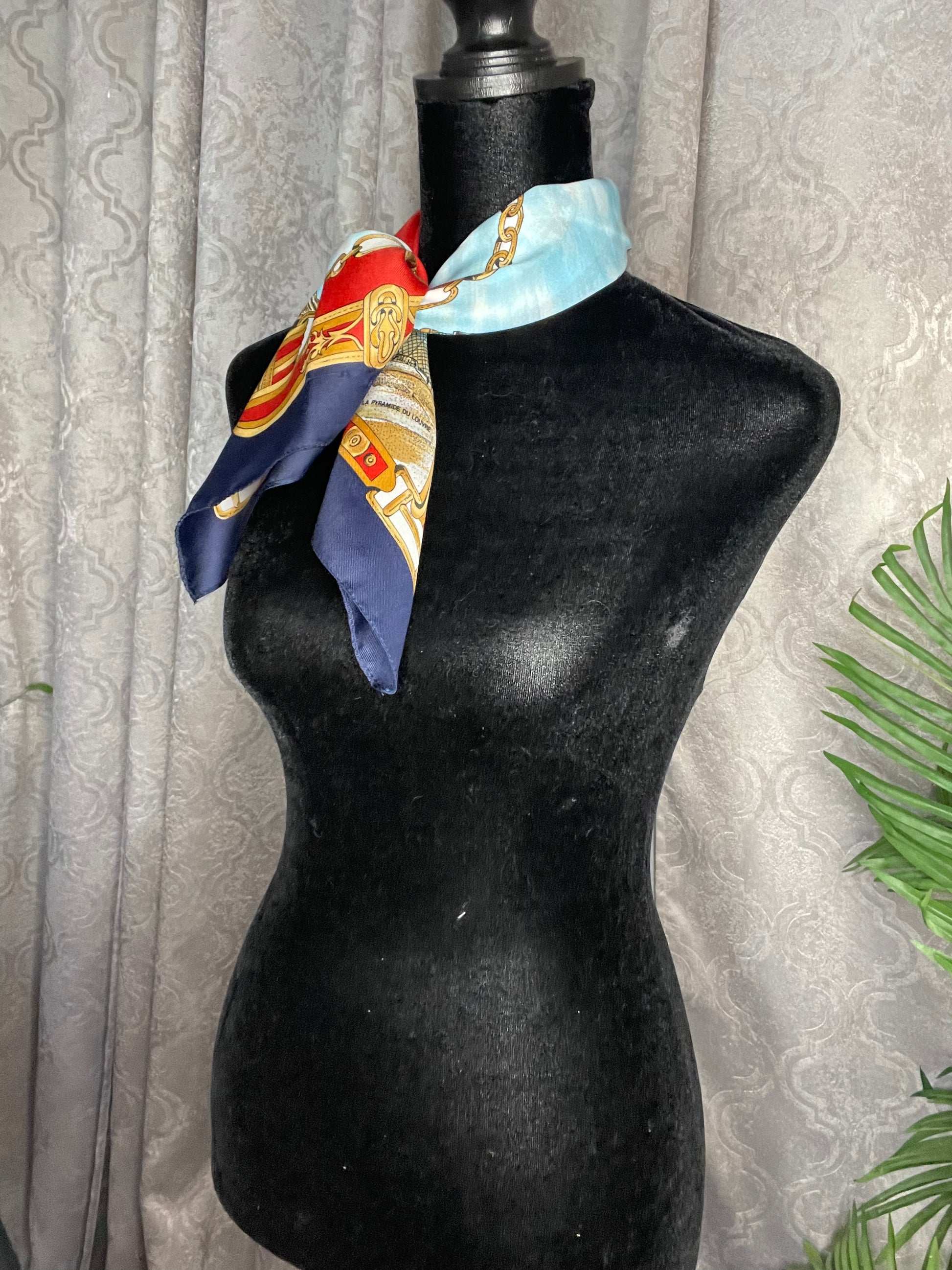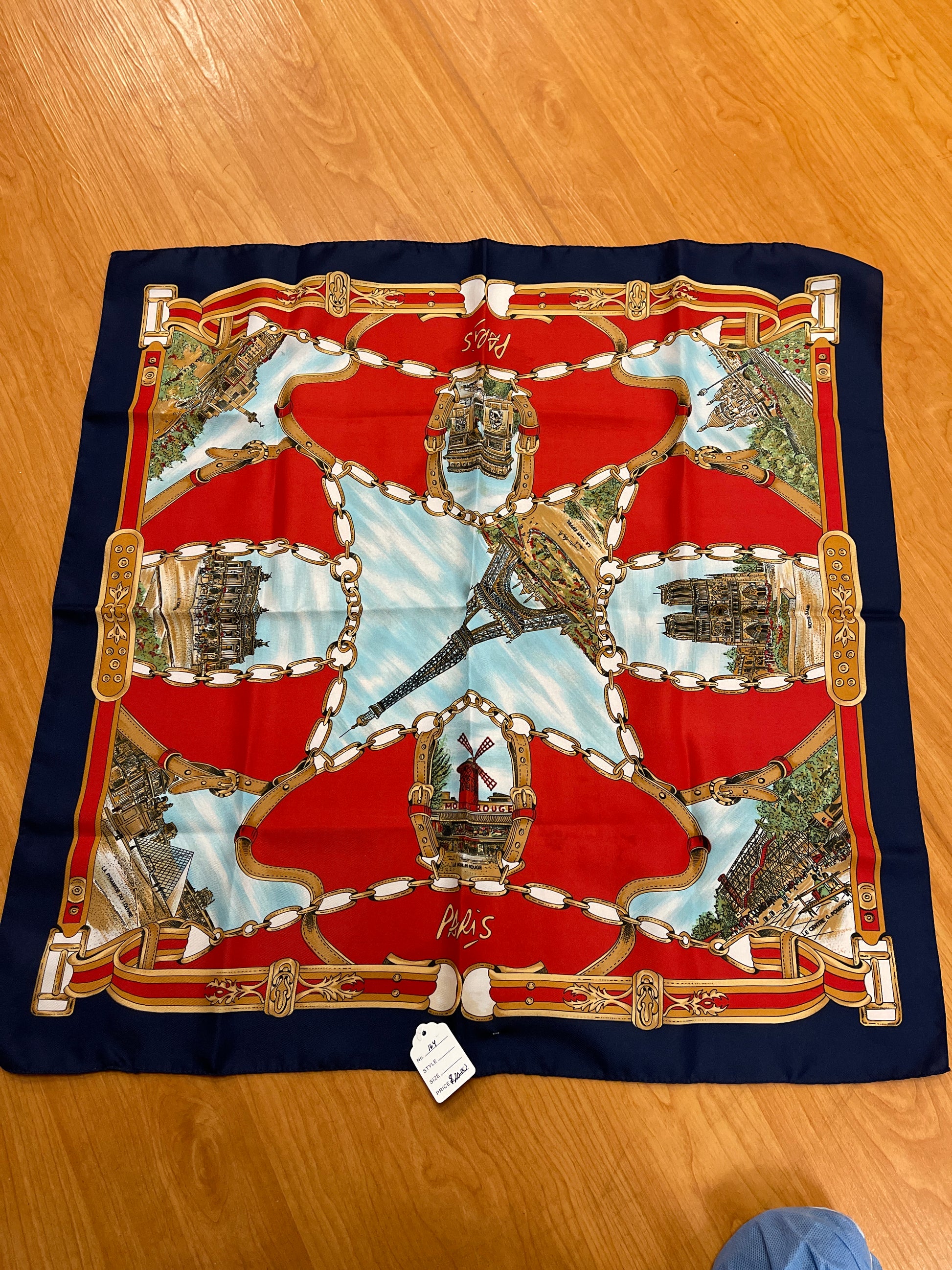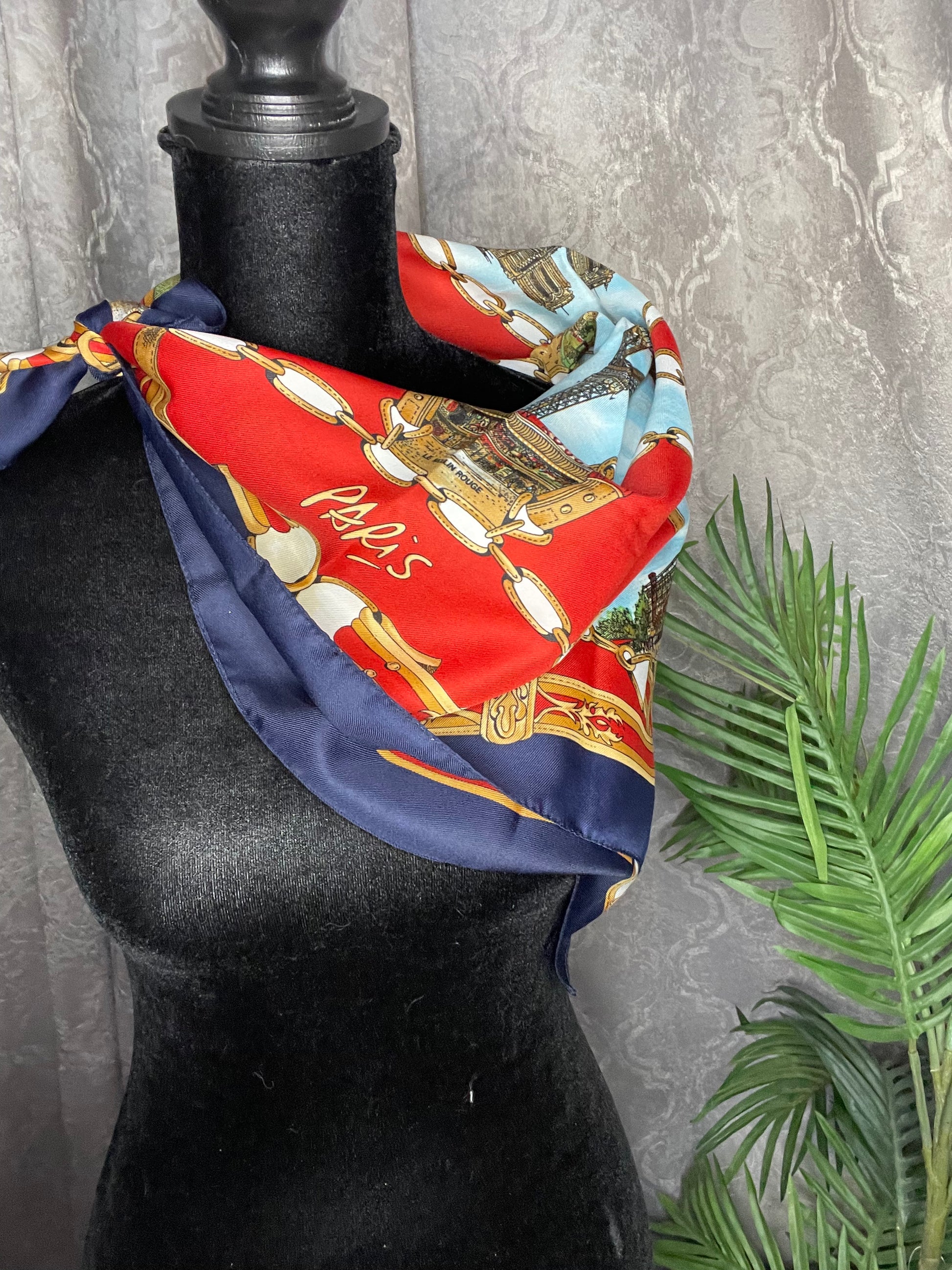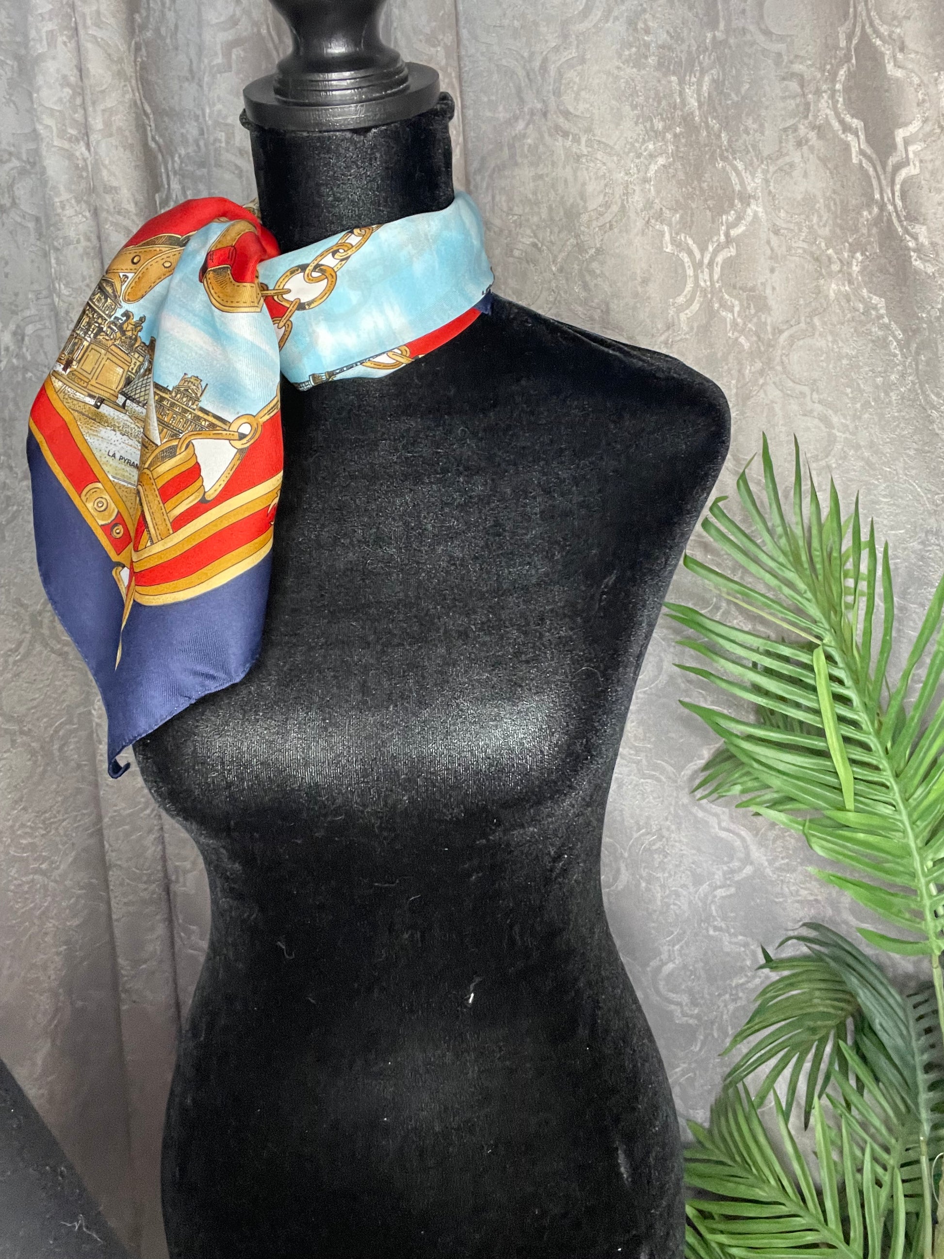 This is a Destination Scarf for Paris, France and has several areas of interest including Sacre Coeur, Le Moulin Rouge, La Pyramide DuLouvre, L'opera De L Bastille,and L'arc De Triompre. This square scarf measures 26 inches by 26 inches. It is a beautiful, silk scarf that would tie nicely around a neck or a purse!