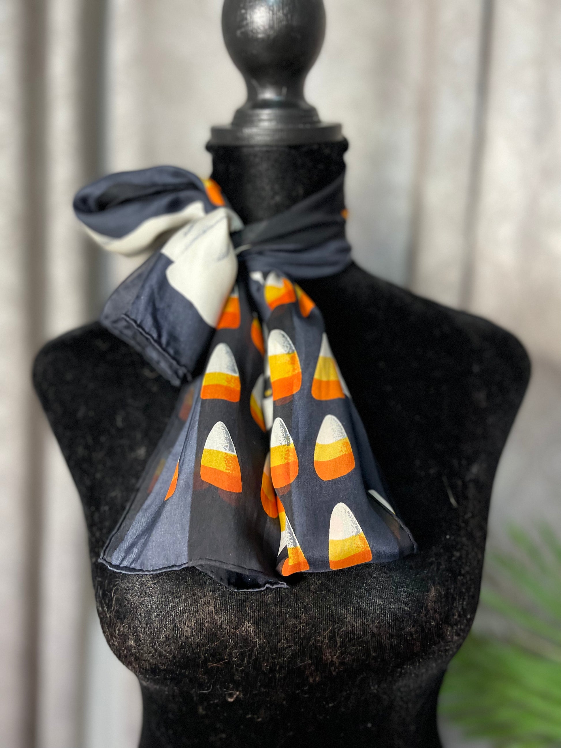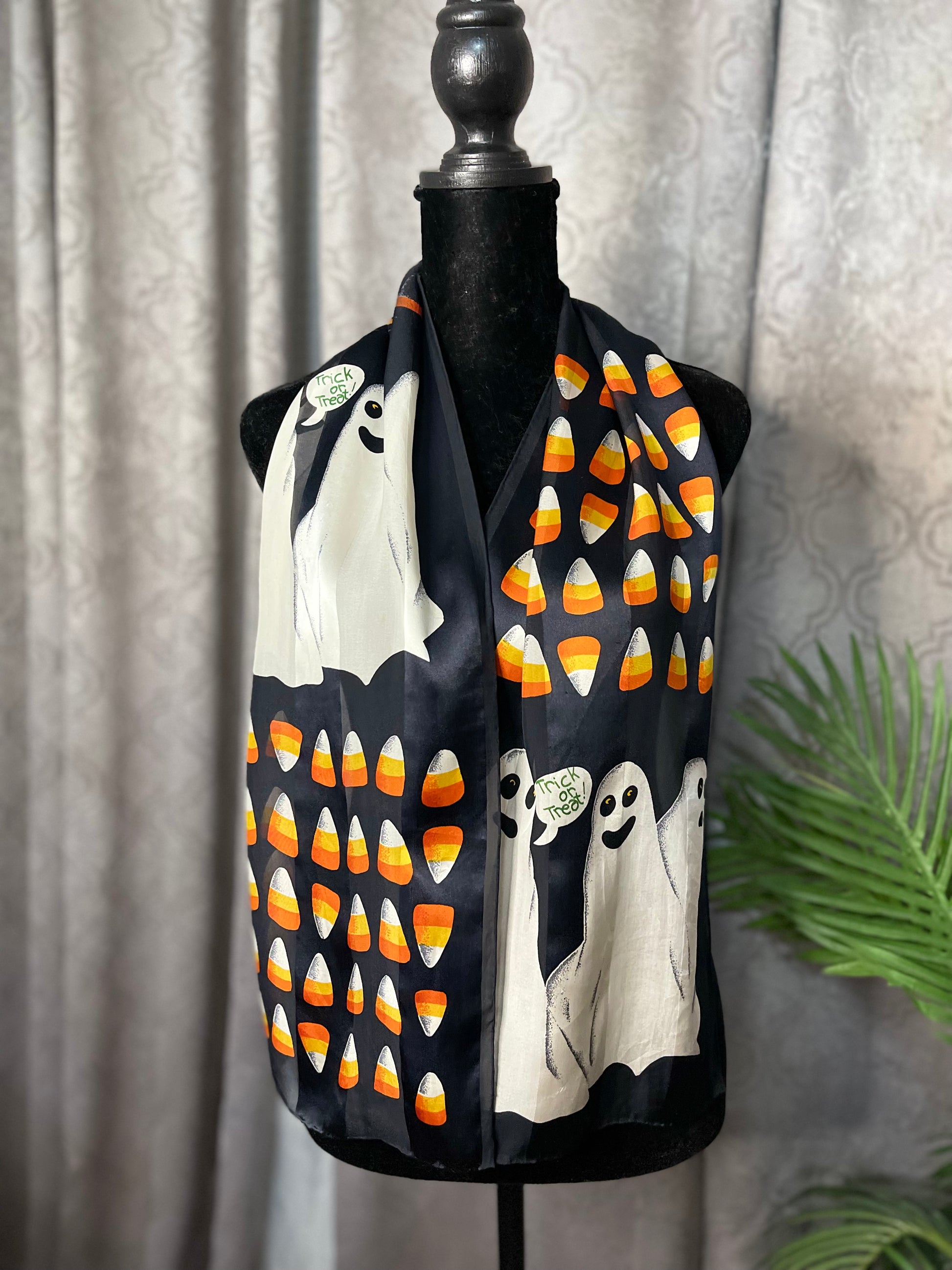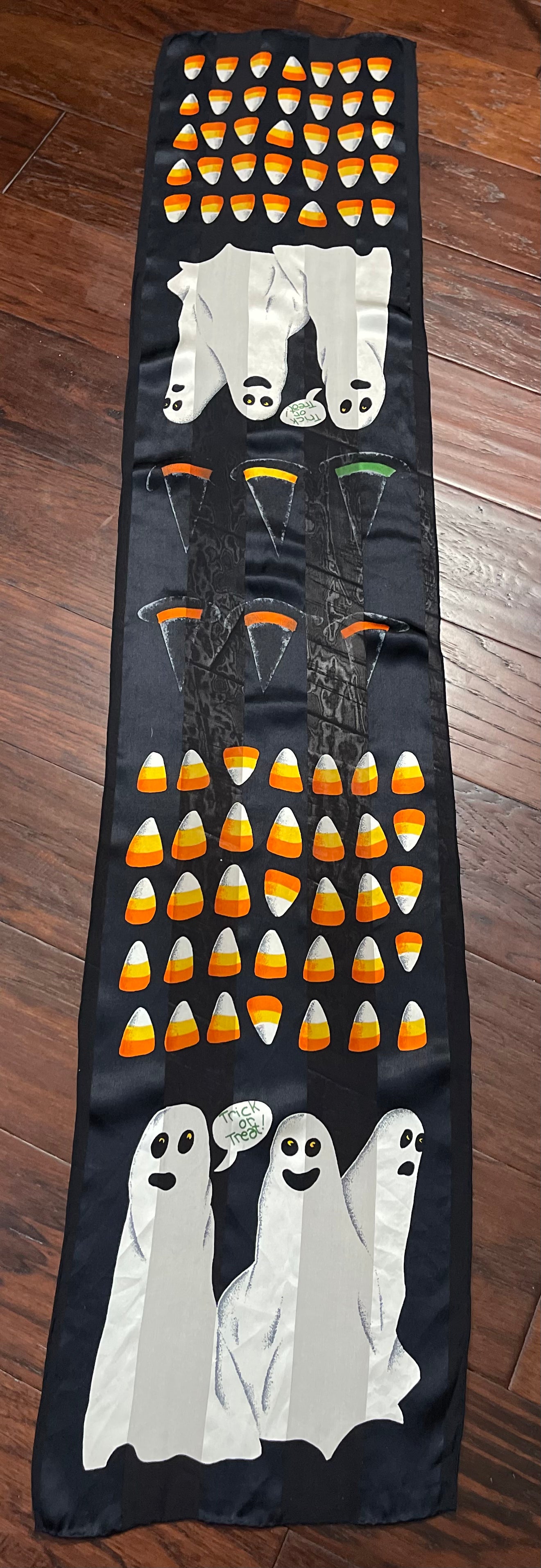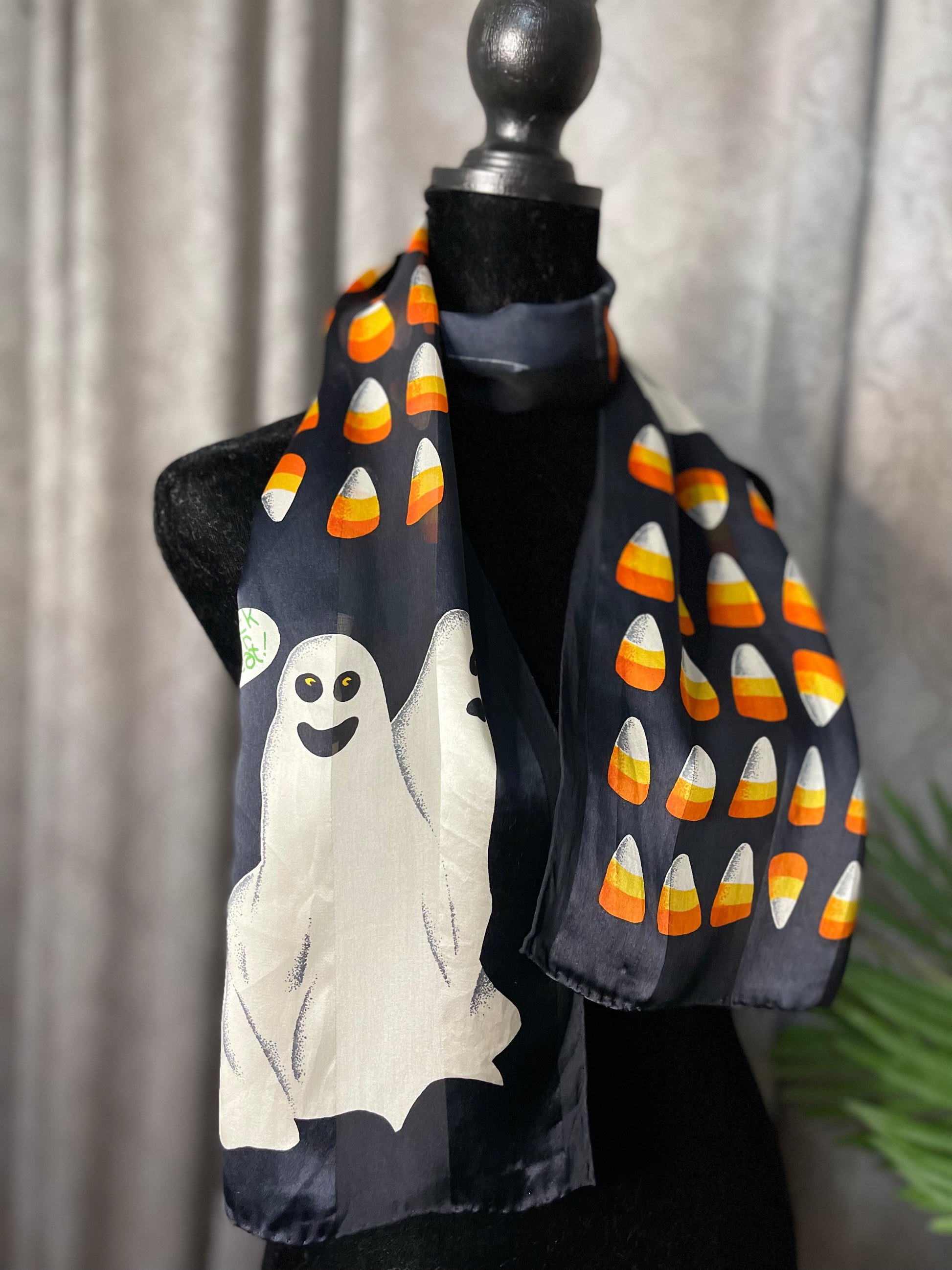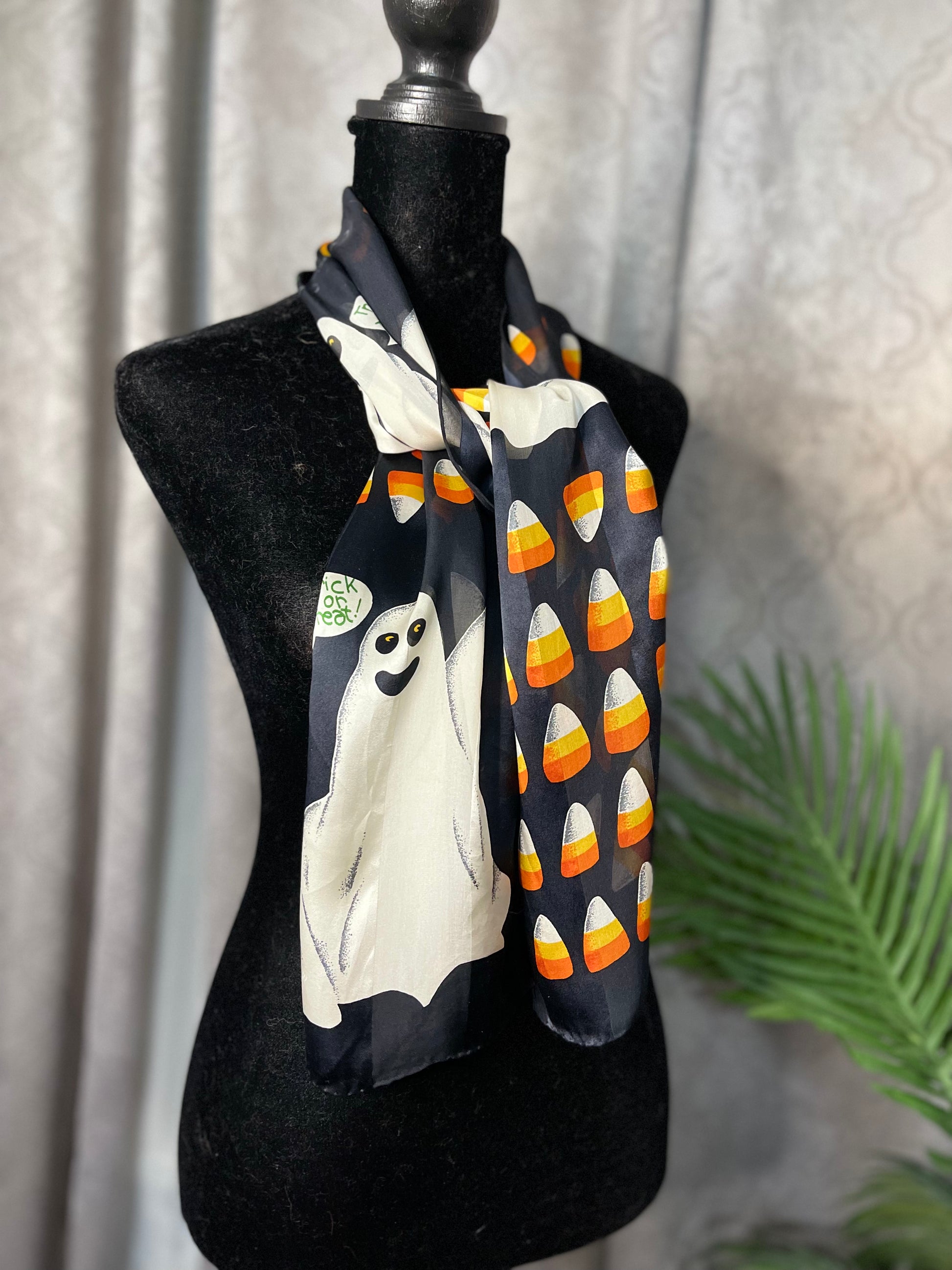 This is such a cute halloween scarf!! This scarf is preowned - and without any tags, but it sure does feel like silk and chiffon. This scarf is rectangular and measures 10.5 inches by 53 inches.