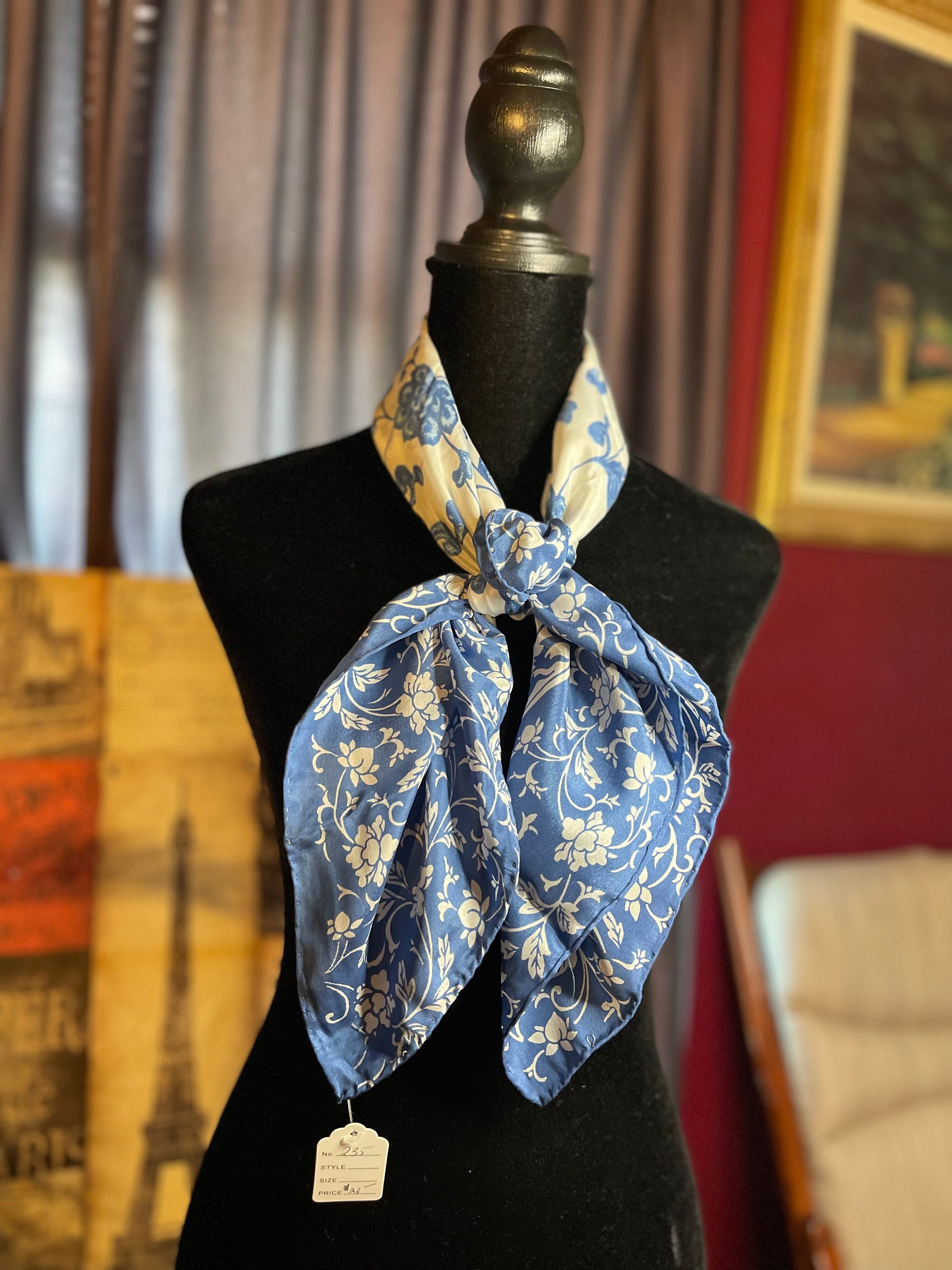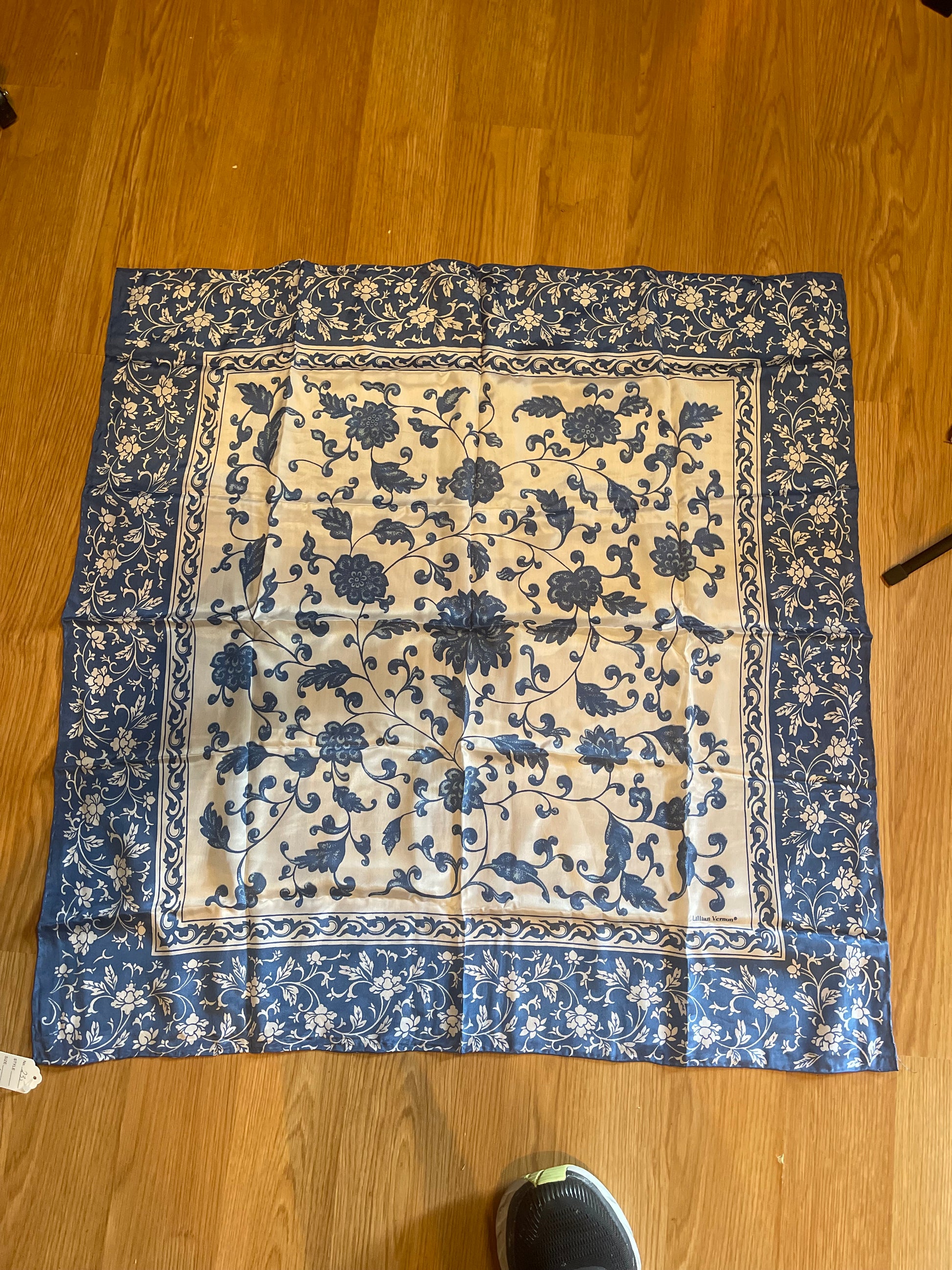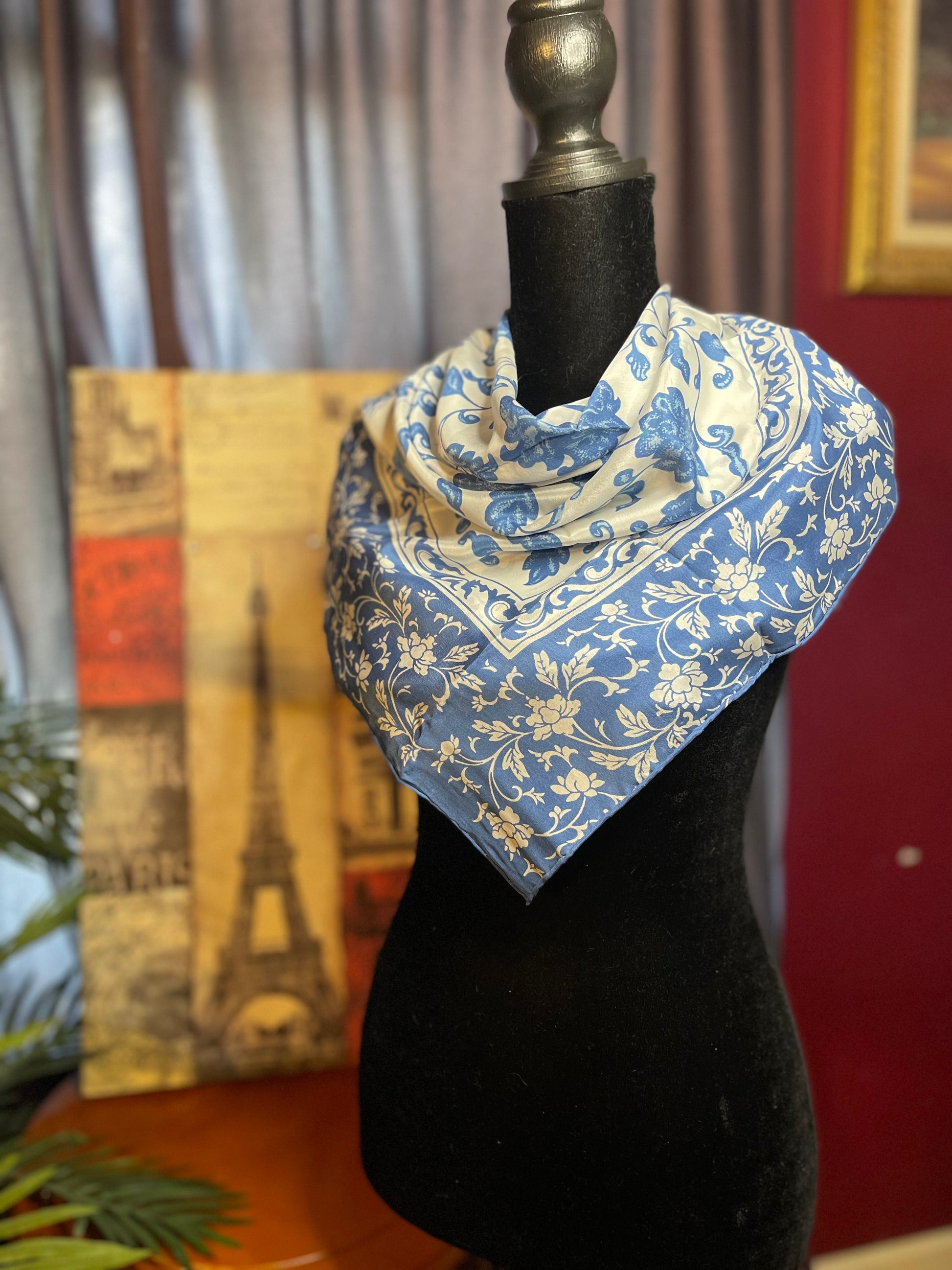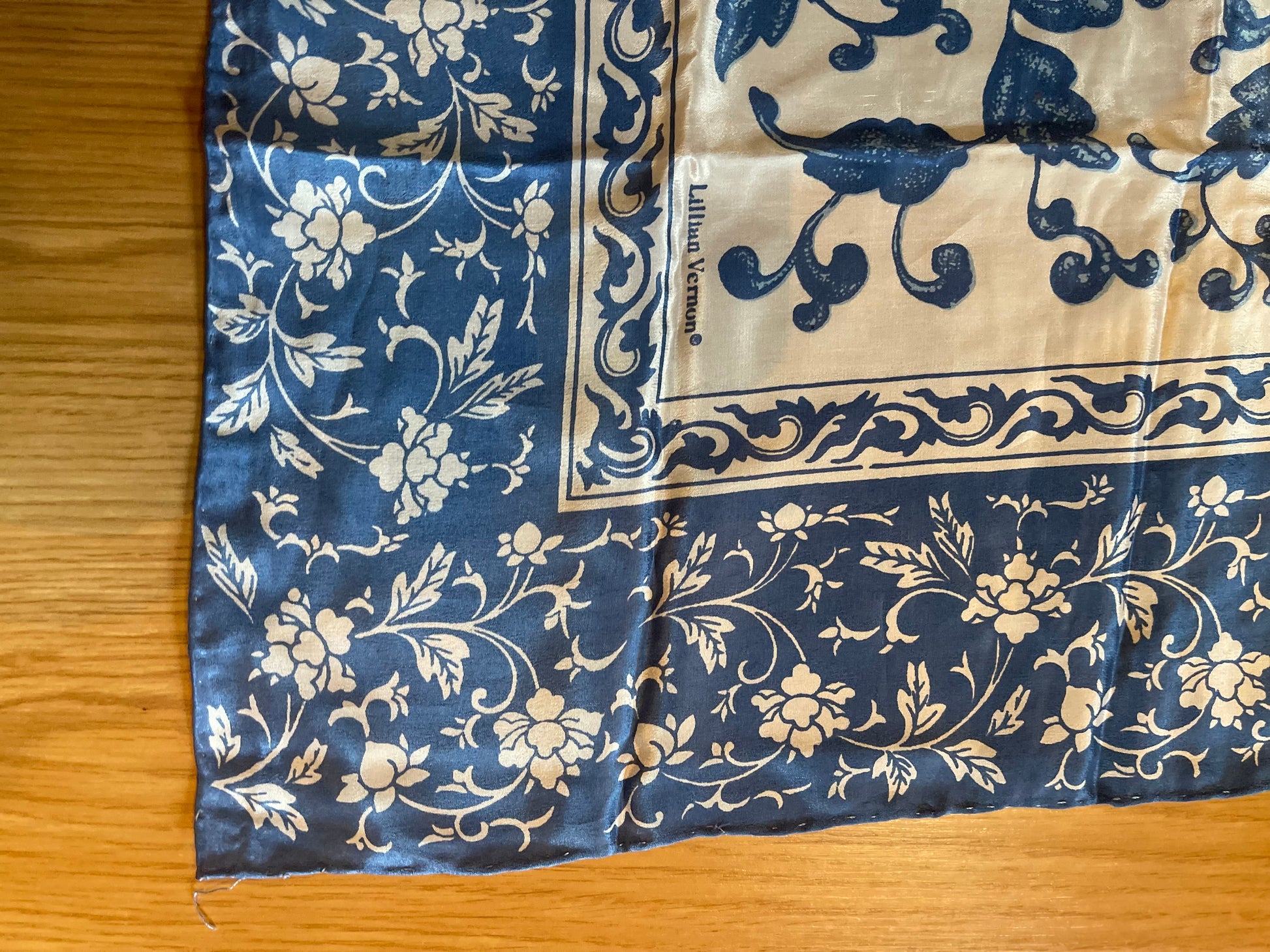 This Lillian Vernon silk scarf is a beautiful large square white and light blue with hand rolled and hand sewn edges. This scarf measures 31 inches by 31 inches.