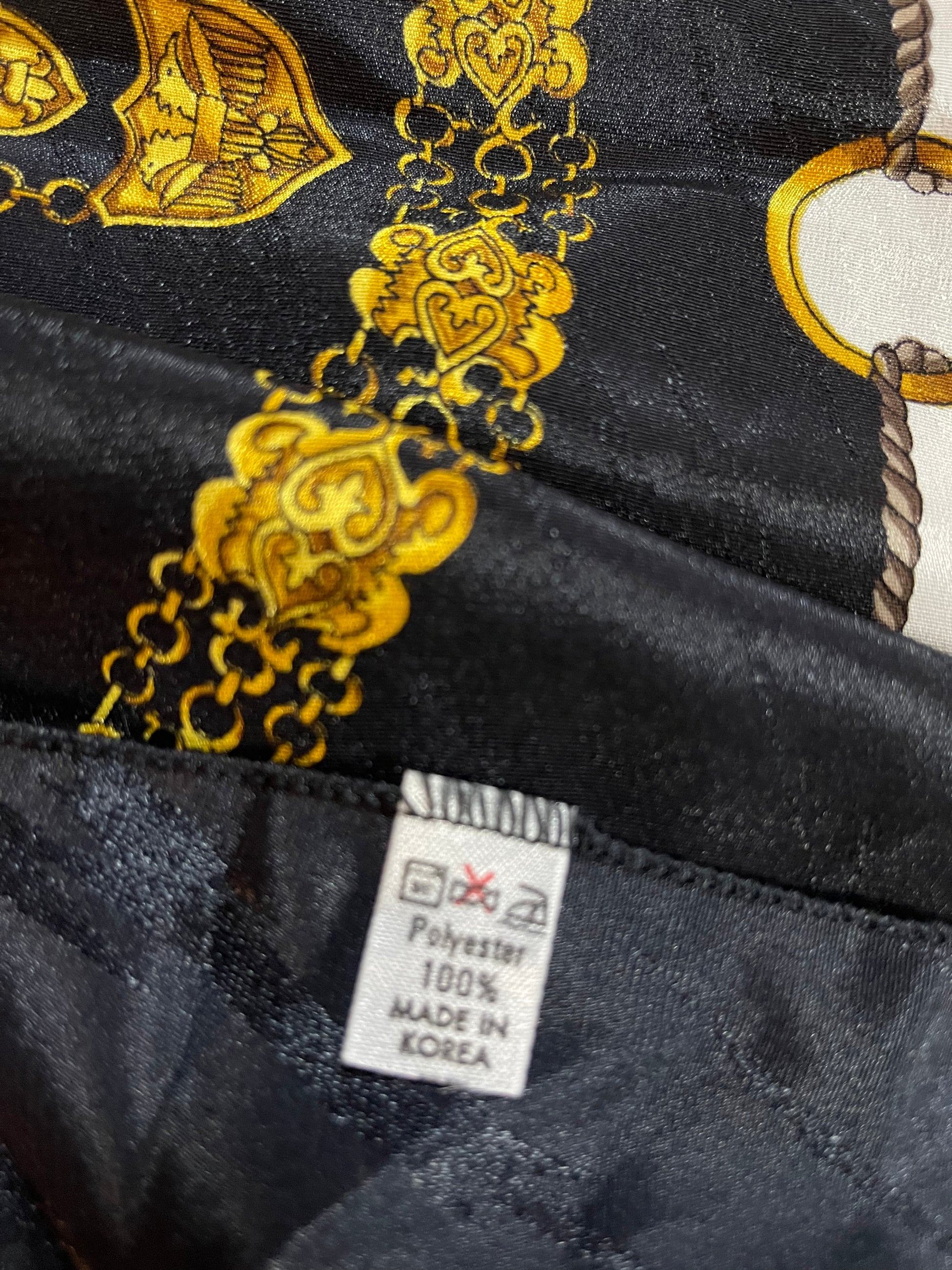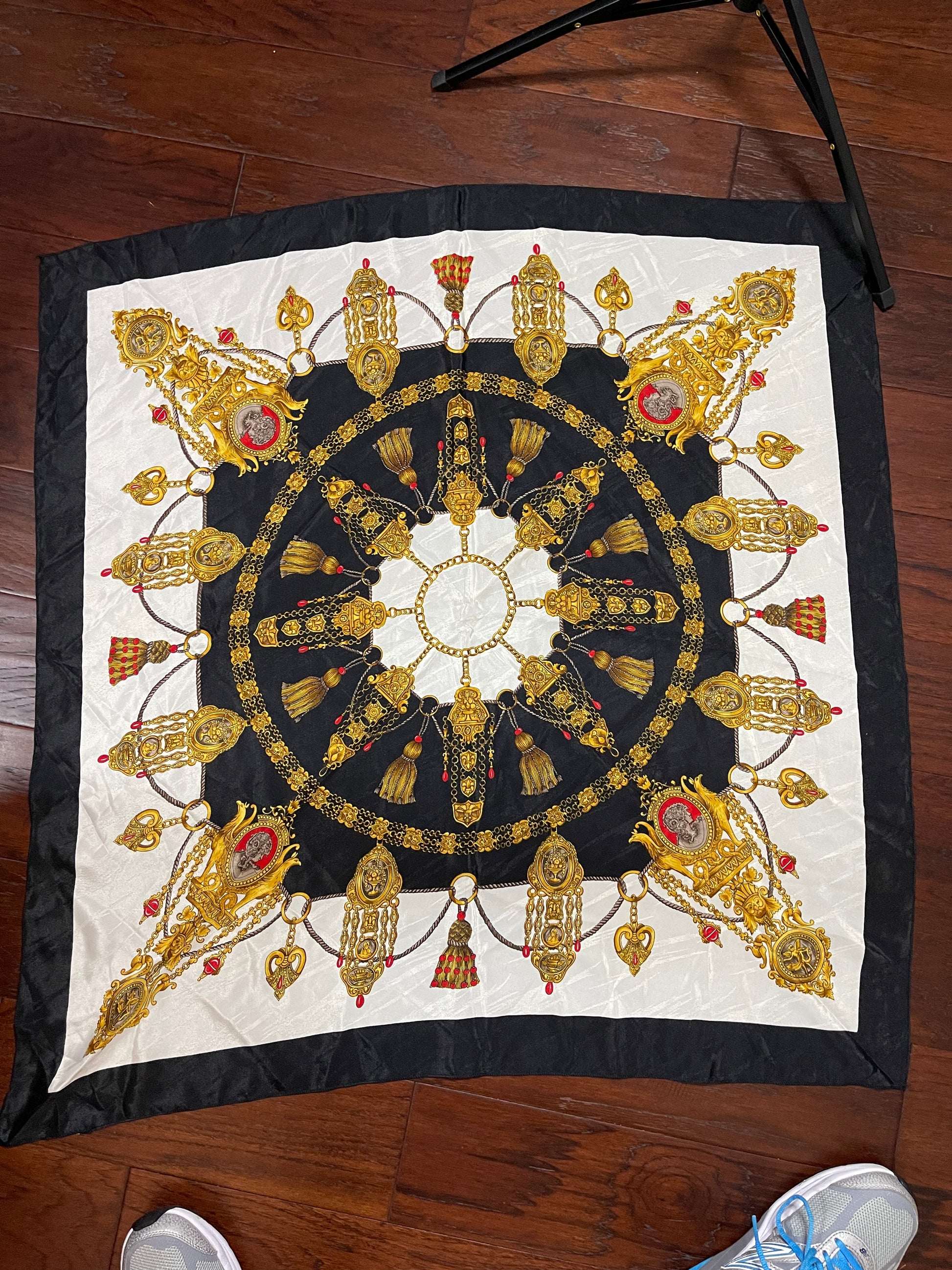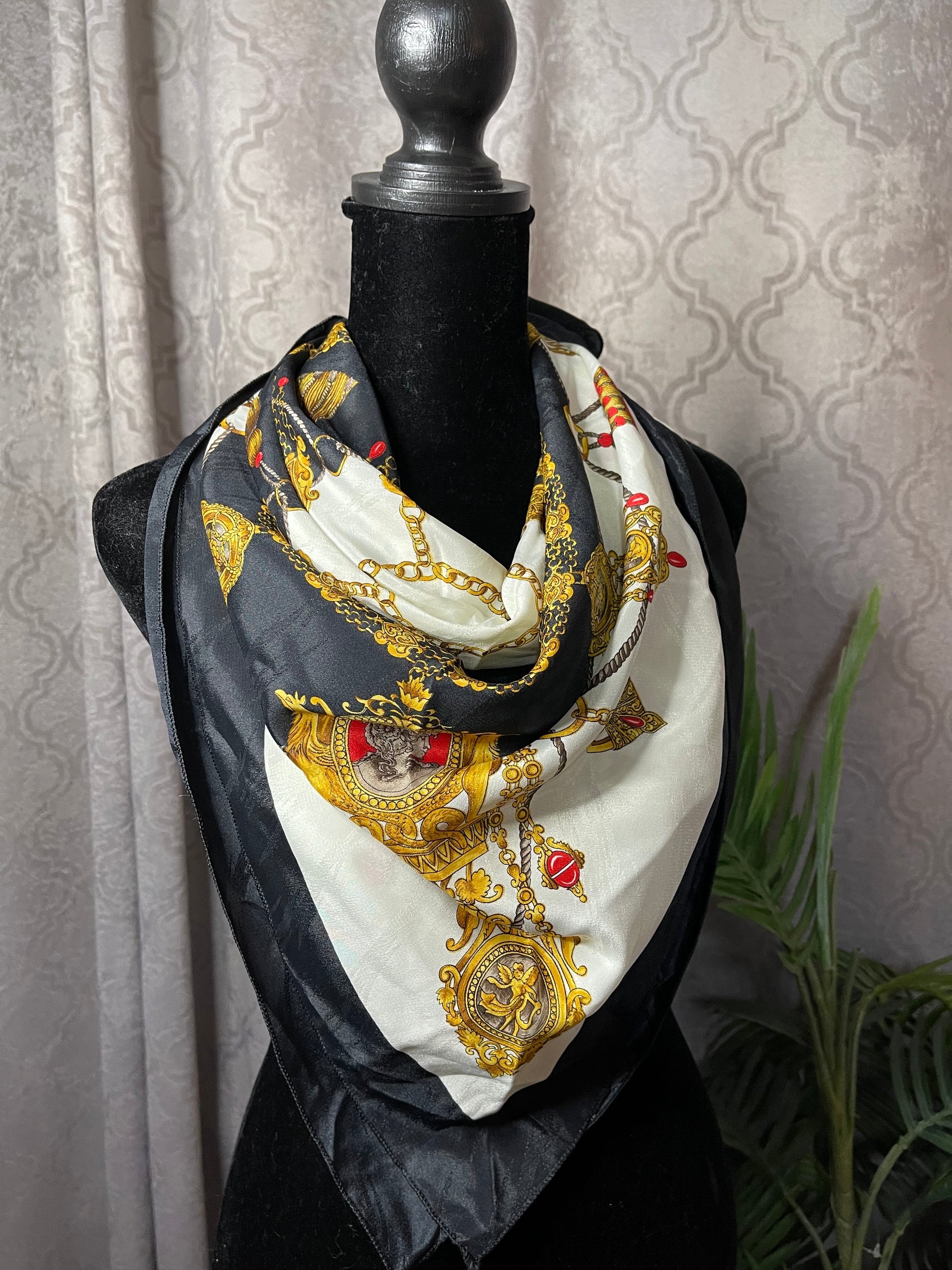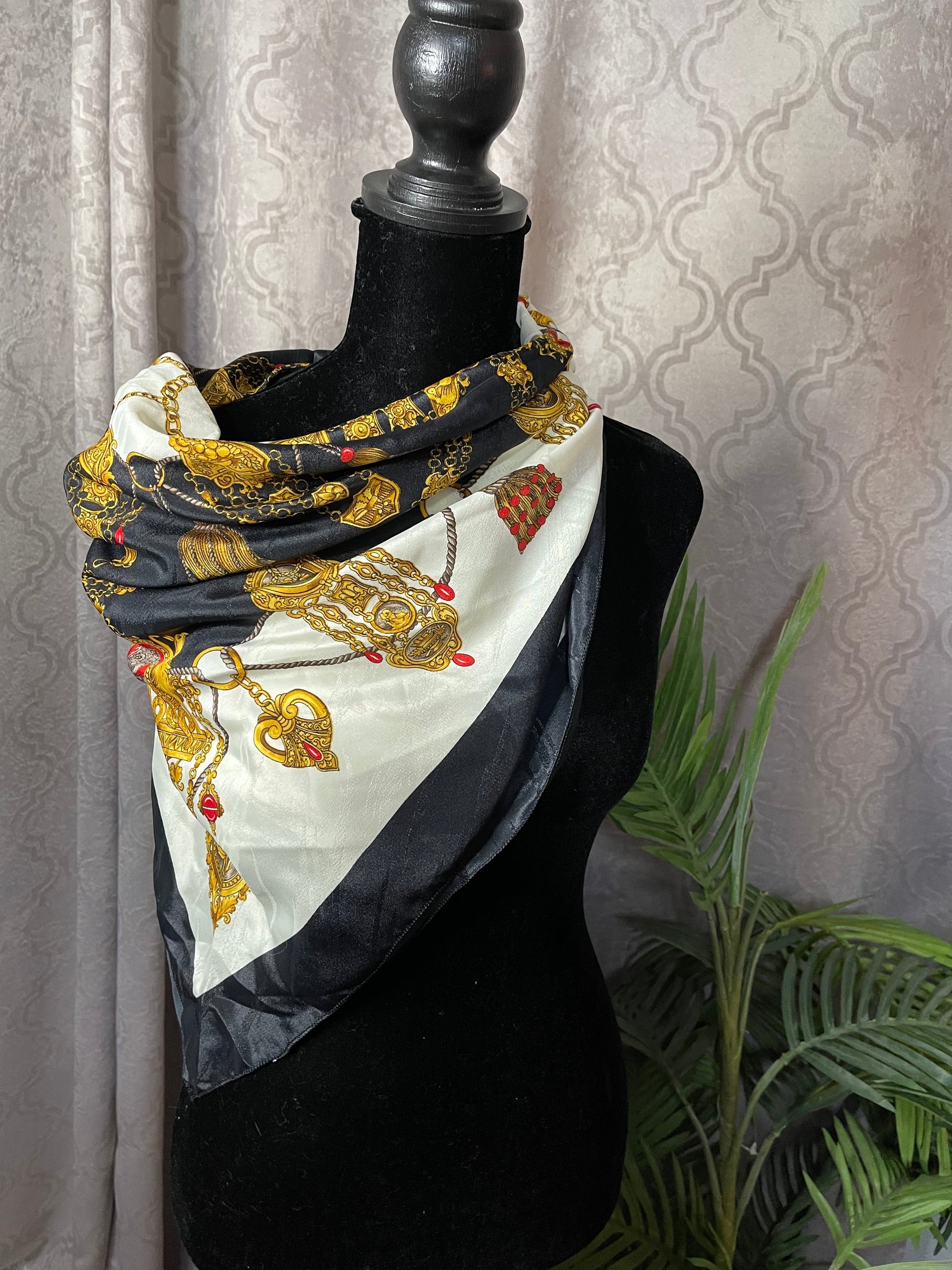 This vintage, pre-owned Scarf has a silk like feel to it but is labeled as polyester. It is decorated with gorgeous black, white background with gold chains and tassels. This scarf measures 35 inches by 34 inches.