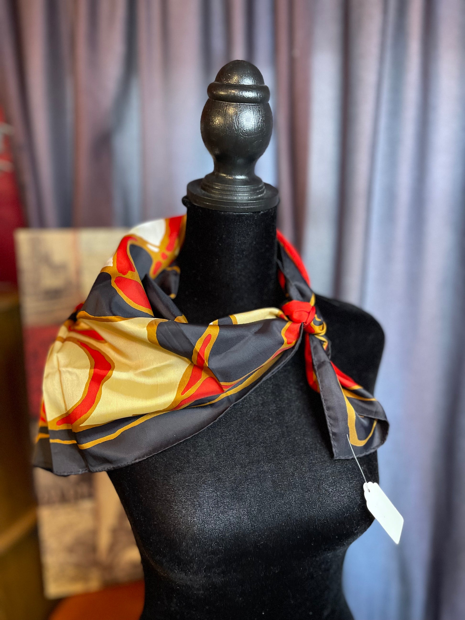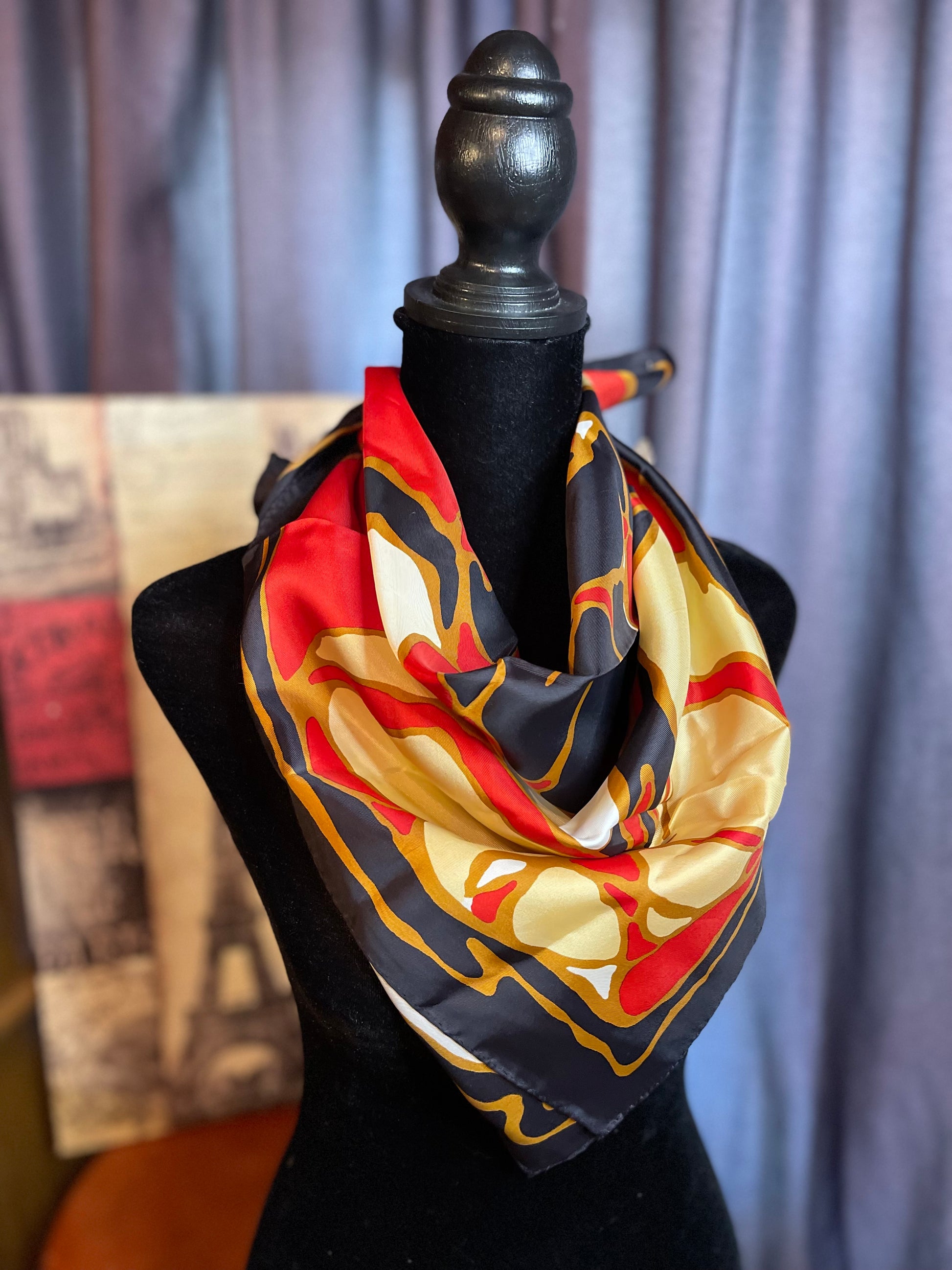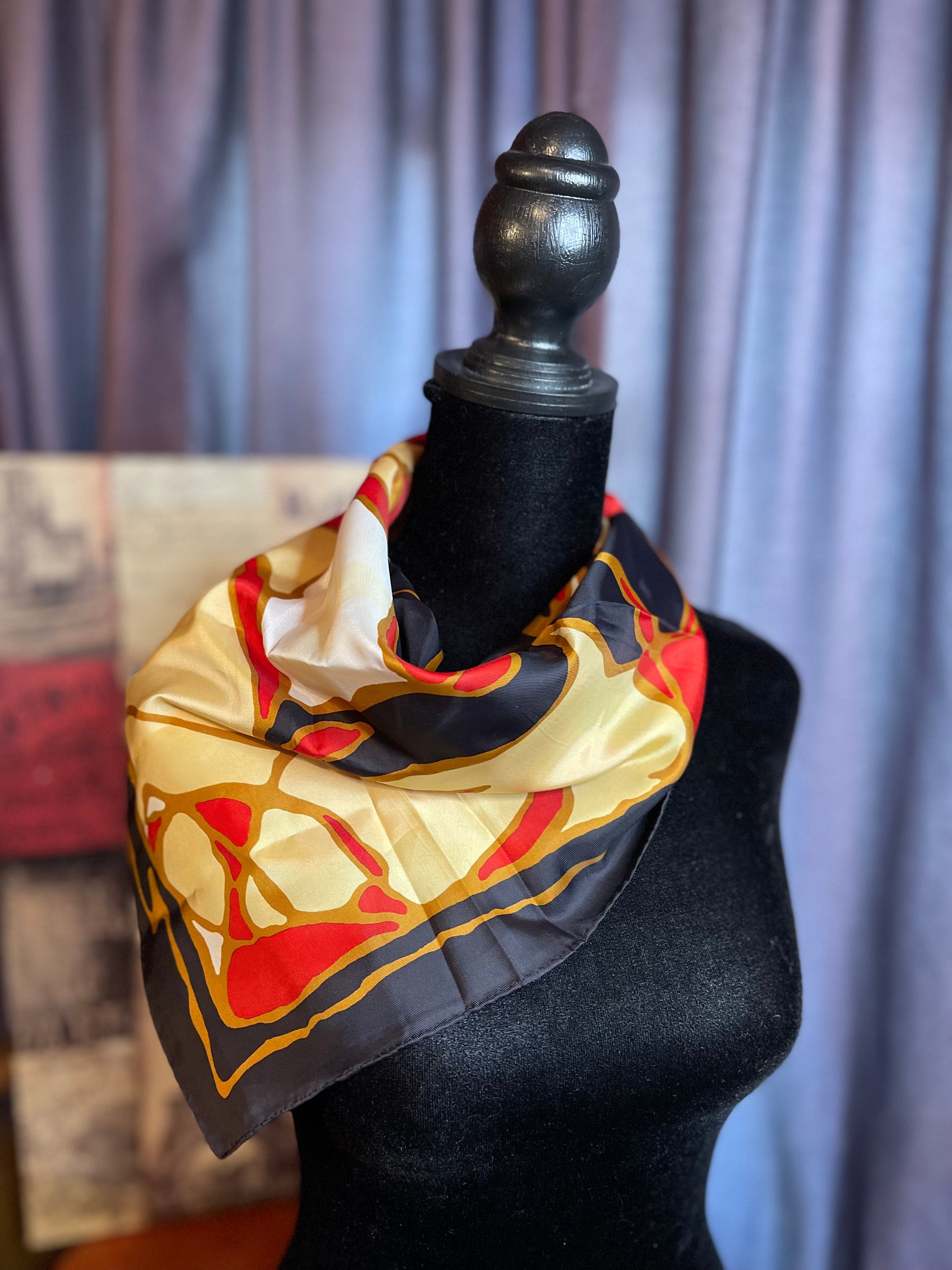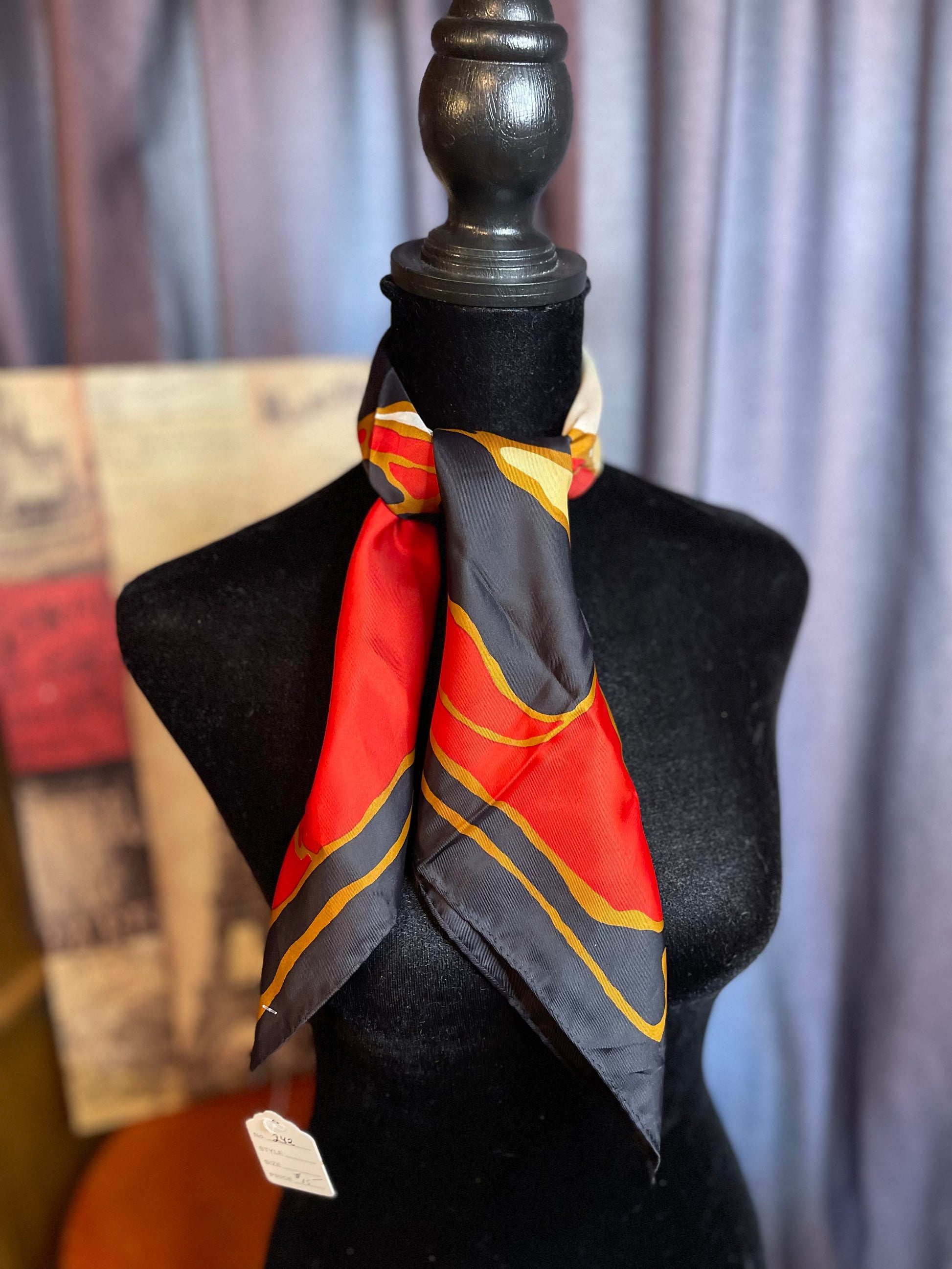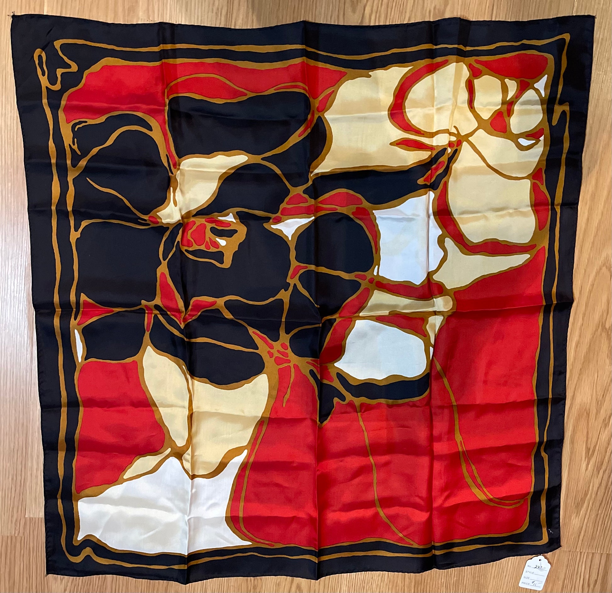Such a beautiful square silk scarf made with lovely black red, brown and light gold colors. This scarf is unsigned and unlabled but is very high quality. The scarf measures 26 inches by 26 inches. Item is preowned and sold as is, no returns.